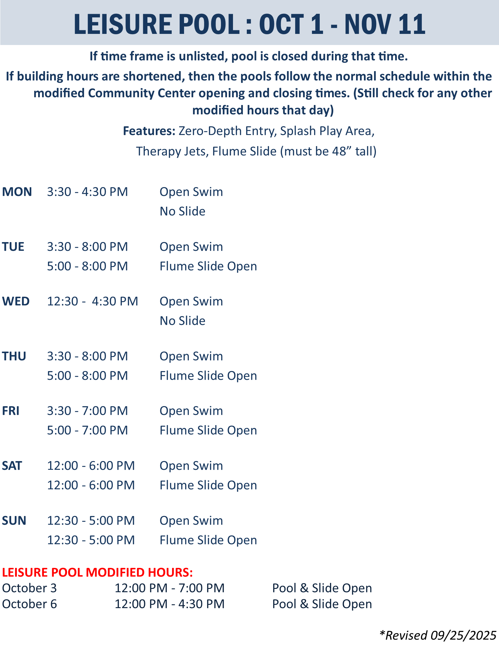 Leisure Pool | October 1, 2025 - November 11, 2025 |