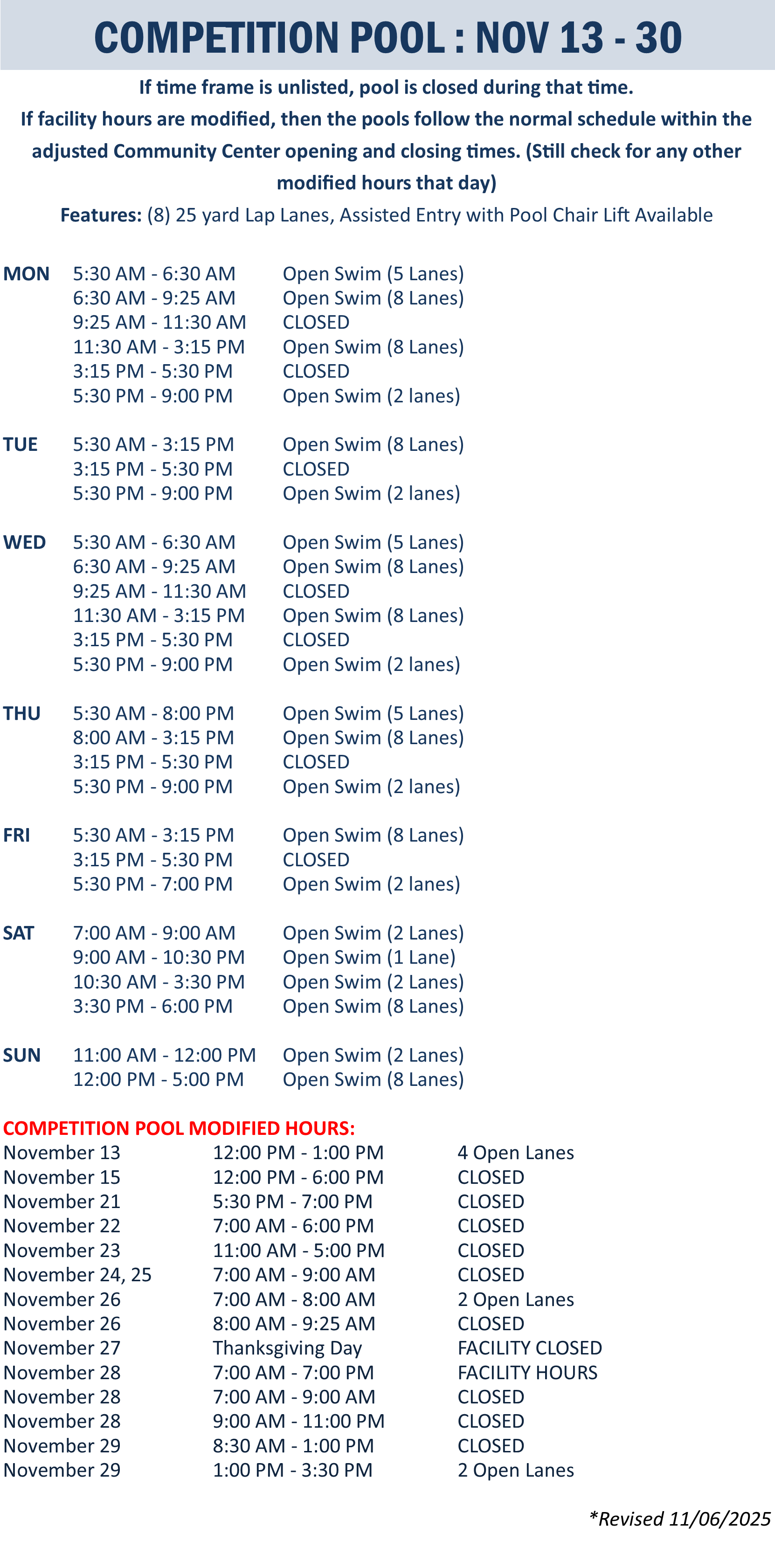 | Leisure Pool | November 13, 2025 - November 30, 2025 |