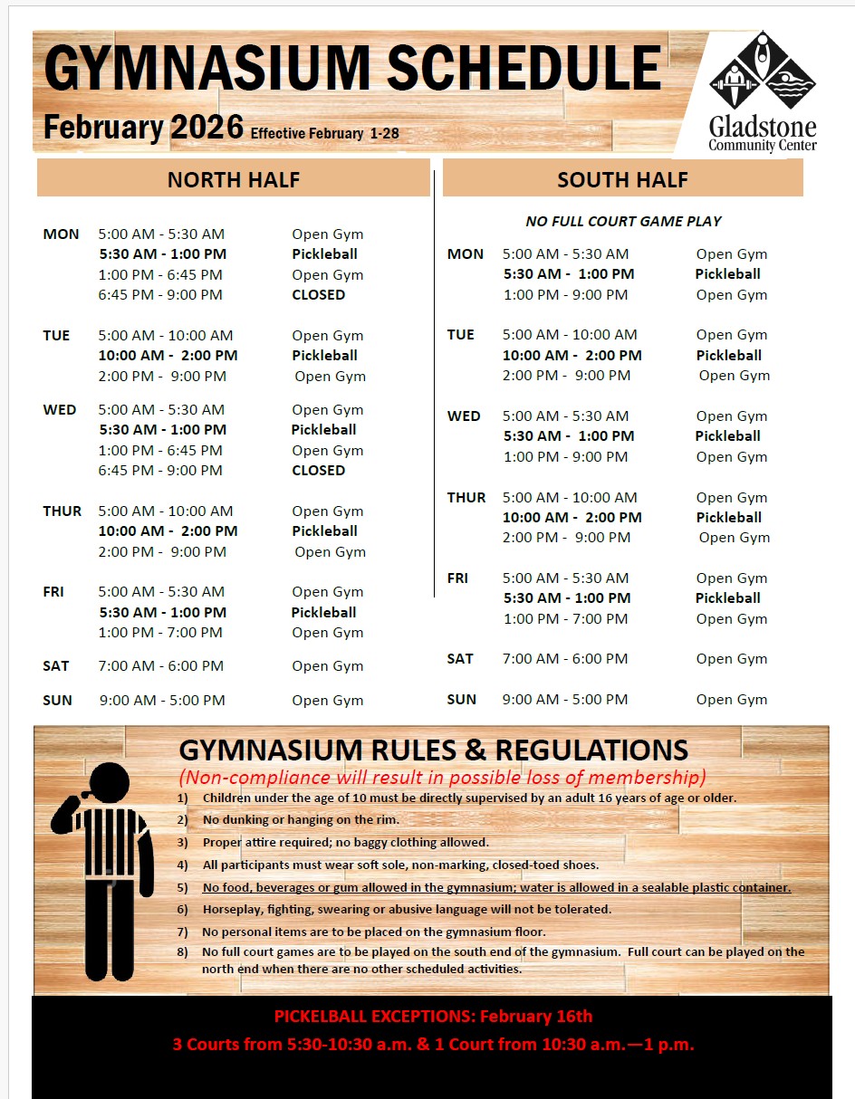 | Gymnasium | February 1, 2026 - February 28, 2026 |