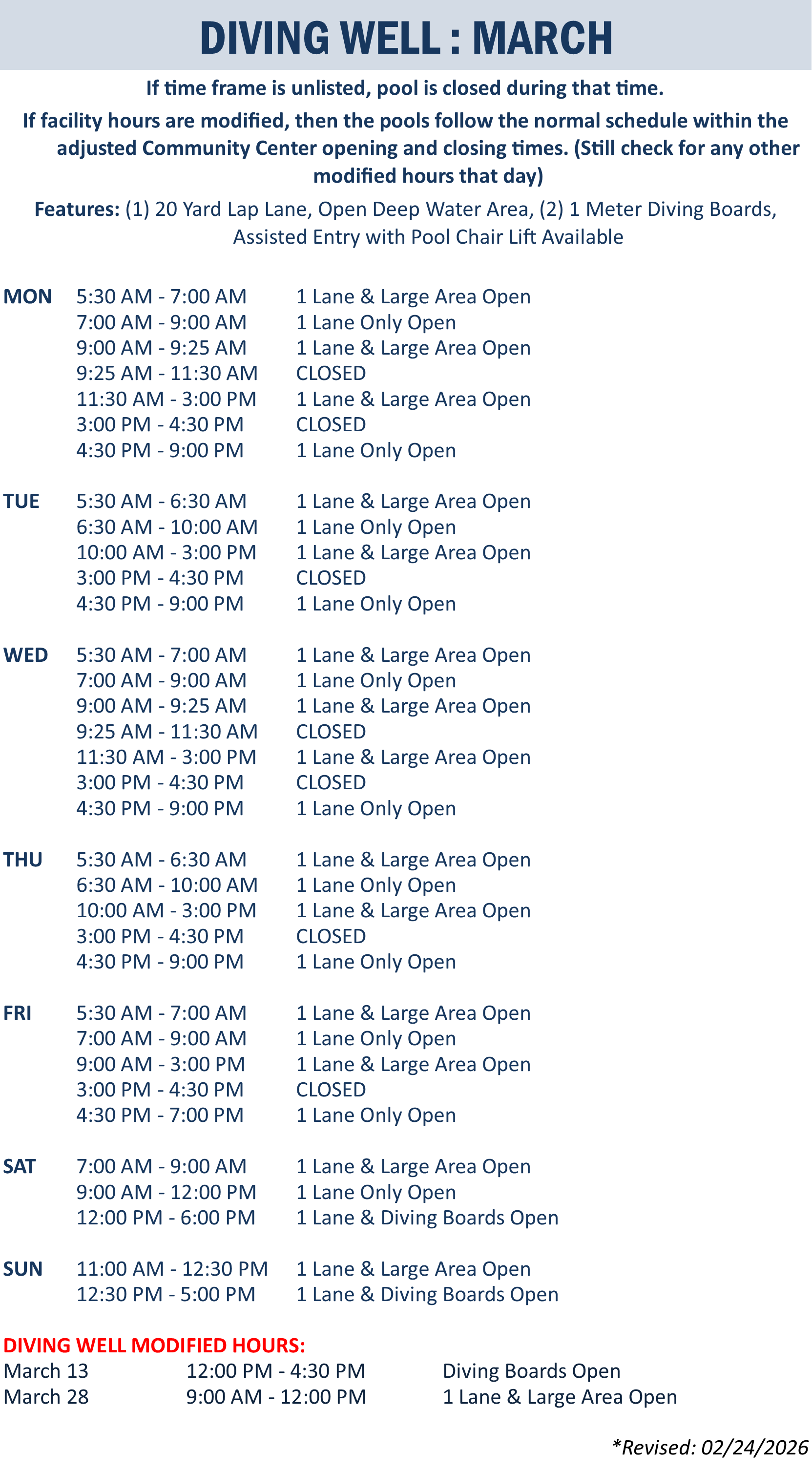 | Leisure Pool | March 1, 2026 - March 31, 2026 |