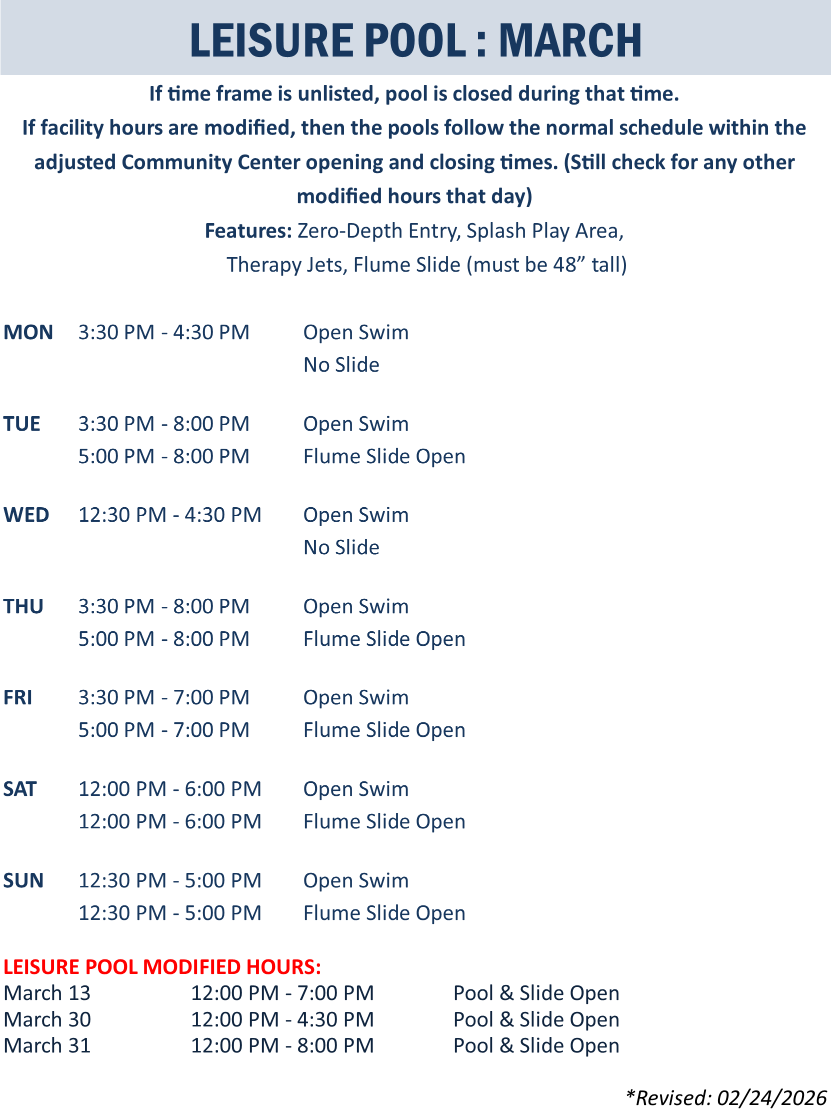 | Leisure Pool | March 1, 2026 - March 31, 2026 |